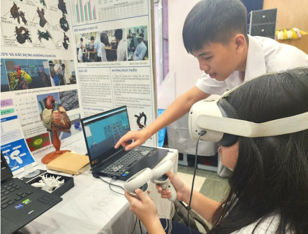 Hai nam sinh lớp 12 của THPT chuyên Lê Hồng Phong, TP HCM, đoạt giải với dự án "Phần mềm tích hợp học sâu để phân vùng và tái tạo cấu trúc tim nguyên khối trong không gian 3D mô phỏng cho ứng dụng thực hành y khoa", thuộc hạng mục Phần mềm hệ thống.